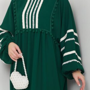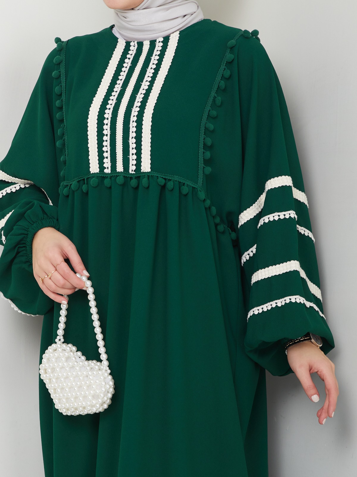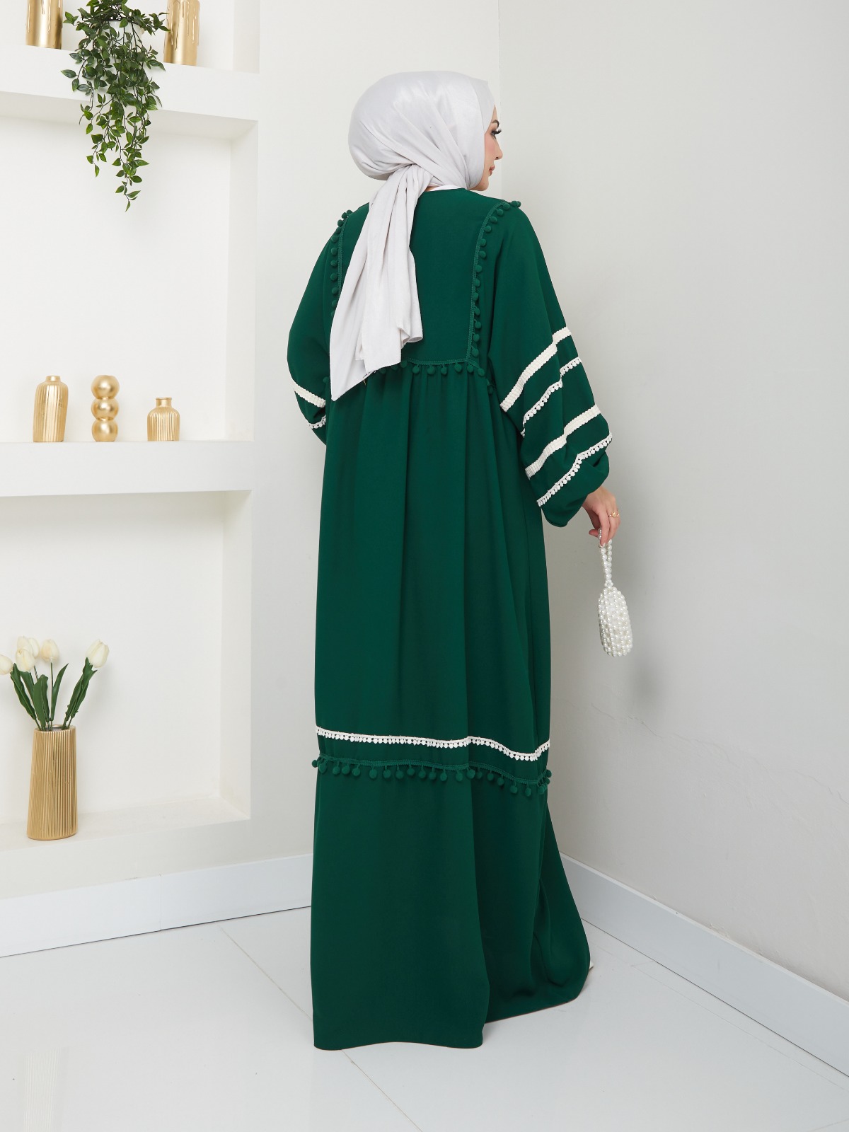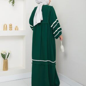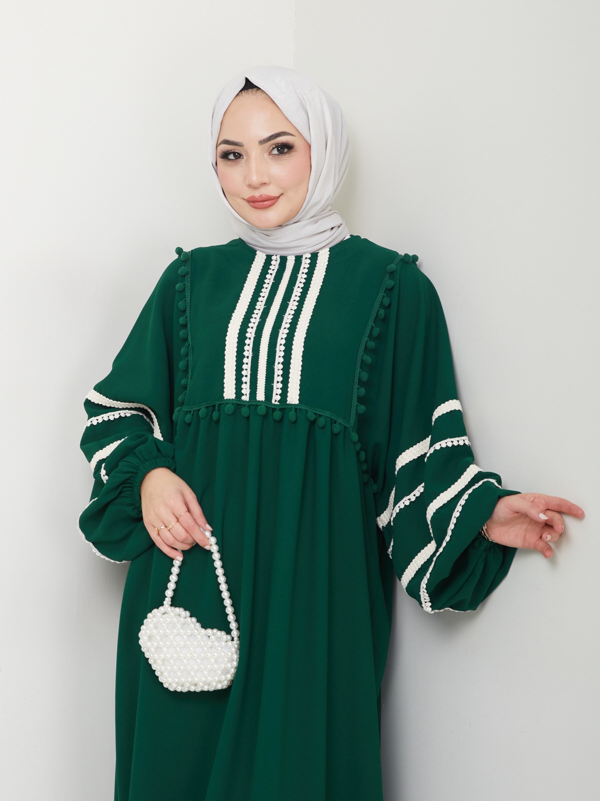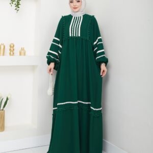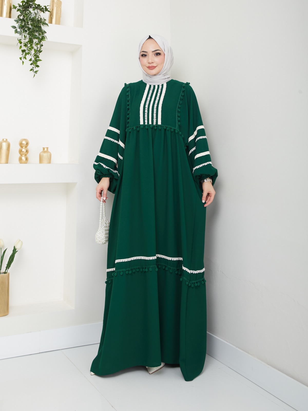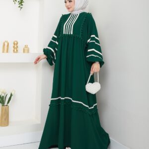 KADIN TESETTÜR DANTELLİ ŞERİT ELBİSE TAŞ Zeytin-Yeşili